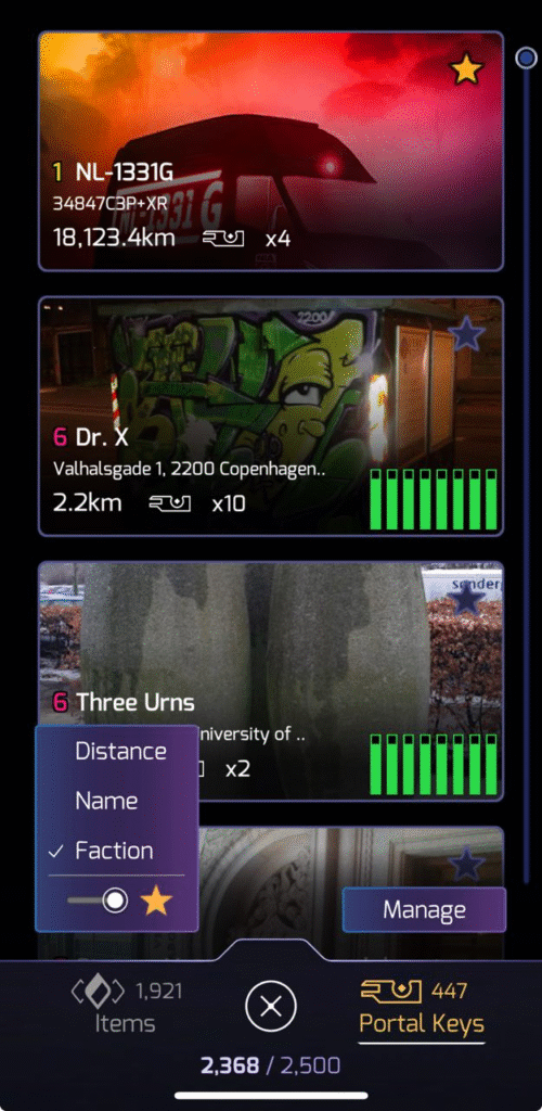 I din oversigt over portalnøgler og i dine nøglekapsler, finder du en ⭐ stjerneknap på individuelle portalnøgler. Hvis du trykker på denne knap, markeres den pågældende portal som stjernemarkeret.